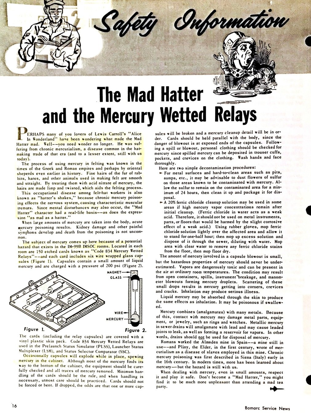 the/DT mad/JJ hatter/NN and/CC the/DT mercury/NN wetted/VBD relays/NNS ,/, perhaps/RB many/JJ of/IN you/PRP lovers/NNS of/IN lewis/NN carroll/NN 's/POS 'alice/NN in/IN wonderland/NN '/'' have/VBP been/VBN wondering/VBG what/WP made/VBD the/DT mad/JJ hatter/NN mad/JJ ./. well--you/DT need/NN wonder/NN no/RB longer/RB ./. he/PRP was/VBD suffering/VBG from/IN chronic/JJ mercurialism/NN ,/, a/DT disease/NN common/JJ in/IN the/DT hat-making/NN trade/NN of/IN that/DT era/NN (/-LRB- and/CC to/TO a/DT lesser/JJR extent/NN ,/, still/RB with/IN us/PRP today/NN )/-RRB- ./. ,/, the/DT process/NN of/IN using/VBG mercury/NN in/IN felting/NN was/VBD known/VBN in/IN the/DT times/NNS of/IN the/DT greek/NN and/CC roman/NN empires/NNS and/CC perhaps/RB by/IN oriental/JJ sheperds/NNS even/RB earlier/RBR in/IN history/NN ./. fine/JJ hairs/NNS of/IN the/DT fur/NN of/IN rabbits/NNS ,/, hares/NNS ,/, and/CC other/JJ animals/NNS used/VBN in/IN making/VBG felt/VBN are/VBP smooth/JJ and/CC straight/JJ ./. by/IN treating/VBG them/PRP with/IN acid/NN nitrate/NN of/IN mercury/NN ,/, the/DT hairs/NNS are/VBP made/VBN limp/JJ and/CC twisted/JJ ,/, which/WDT aids/VBZ the/DT felting/NN process/NN ./. ,/, this/DT occupational/JJ disease/NN among/IN felt-hat/JJ workers/NNS is/VBZ also/RB known/VBN as/IN 'hatter/JJR 's/POS shakes'/NNS ,/, because/IN chronic/JJ mercury/NN poisoning/NN effects/NNS the/DT nervous/JJ system/NN ,/, causing/VBG characteristic/JJ muscular/JJ tremors/NNS ./. since/IN mental/JJ disturbances/NNS may/MD also/RB occur/VB ,/, the/DT 'mad/JJ hatter/NN '/POS character/NN had/VBD a/DT real-life/NN basis--as/NN does/VBZ the/DT expression/NN 'mad/JJ as/IN a/DT hatter/NN './. ,/, when/WRB large/JJ amounts/NNS of/IN mercury/NN are/VBP taken/VBN in/IN to/TO the/DT body/NN ,/, acute/JJ mercury/NN poisoning/NN results/NNS ./. kidney/NN damage/NN and/CC other/JJ painful/JJ symptoms/NNS develop/VBP and/CC death/NN from/IN the/DT poisoning/NN is/VBZ not/RB uncommon/JJ ./. ,/, the/DT subject/NN of/IN mercury/NN comes/VBZ up/RP here/RB because/IN of/IN a/DT potential/JJ hazard/NN that/WDT exists/VBZ in/IN the/DT im-99b/JJ imsoc/NN rooms/NNS ./. located/VBN in/IN each/DT room/NN are/VBP 150/CD etched/JJ cards/NNS known/VBN as/IN 'code/JJ 834/CD mercury/NN wetted/VBD relays'--and/NNP each/DT card/NN includes/VBZ six/CD wire/NN wrapped/VBD glass/NN capsules/NNS (/-LRB- figure/NN 1/CD )/-RRB- ./. capsules/NNS contain/VBP a/DT small/JJ amount/NN of/IN liquid/JJ mercury/NN and/CC are/VBP charged/VBN with/IN a/DT pressure/NN of/IN 200/CD psi/FW (/-LRB- figure/NN 2/CD )/-RRB- ./. the/DT cards/NNS (/-LRB- including/VBG the/DT relay/NN capsules/NNS )/-RRB- are/VBP covered/VBN with/IN a/DT vinyl/NN plastic/NN skin/NN pack/VB ./. code/NN 834/CD mercury/NN wetted/VBD relays/NNS are/VBP used/VBN in/IN the/DT prelaunch/NN status/NN simulator/NN (/-LRB- plss/NN )/-RRB- ,/, launcher/JJR status/NN multiplexer/NN (/-LRB- lsm/NN )/-RRB- ,/, and/CC status/NN selector/NN comparator/NN (/-LRB- ssc/NN )/-RRB- ./. ,/, occasionally/RB capsules/NNS will/MD explode/VB while/IN in/IN place/NN ,/, spewing/VBG mercury/NN in/IN the/DT cabinet/NN ./. although/IN most/JJS of/IN the/DT mercury/NN finds/VBZ its/PRP$ way/NN to/TO the/DT bottom/NN of/IN the/DT cabinet/NN ,/, the/DT equipment/NN should/MD be/VB carefully/RB checked/VBN and/CC all/DT traces/NNS of/IN mercury/NN removed/VBN ./. minimum/NN handling/NN of/IN cards/NNS should/MD be/VB the/DT rule/NN ,/, and/CC when/WRB handling/NN is/VBZ necessary/JJ ,/, utmost/JJ care/NN should/MD be/VB practiced/VBN ./. cards/NNS should/MD not/RB be/VB forced/VBN or/CC bent/VBN ./. if/IN dropped/VBD ,/, the/DT odds/NNS are/VBP that/IN one/CD or/CC more/JJR capsules/NNS will/MD be/VB broken/VBN and/CC a/DT mercury/NN cleanup/NN detail/NN will/MD be/VB in/IN order/NN ./. cards/NNS should/MD be/VB held/VBN parallel/RB with/IN the/DT body/NN ,/, since/IN the/DT danger/NN of/IN blowout/NN is/VBZ at/IN exposed/JJ ends/NNS of/IN the/DT capsules/NNS ./. following/VBG a/DT spill/NN or/CC blowout/NN ,/, personal/JJ clothing/NN should/MD be/VB checked/VBN for/IN mercury/NN since/IN spilled/VBN mercury/NN can/MD be/VB deposited/VBN in/IN trouser/NN cuffs/NNS ,/, pockets/NNS ,/, and/CC crevices/NNS on/IN the/DT clothing/NN ./. wash/NN hands/NNS and/CC face/NN thoroughly/RB ./. ,/, here/RB are/VBP two/CD simple/JJ decontamination/NN procedures/NNS :/: ,/, for/IN metal/NN surfaces/NNS and/CC hard-to-clean/JJ areas/NNS such/JJ as/IN pits/NNS ,/, sumps/NNS ,/, etc./FW ,/, it/PRP may/MD be/VB advisable/JJ to/TO dust/VB flowers/NNS of/IN sulfur/NN on/IN those/DT areas/NNS known/VBN to/TO be/VB contaminated/VBN with/IN mercury/NN ./. allow/VB the/DT sulfur/NN to/TO remain/VB on/IN the/DT contaminated/JJ area/NN for/IN a/DT minimum/NN of/IN 24/CD hours/NNS ,/, then/RB clean/VB it/PRP up/RP and/CC package/VB it/PRP for/IN disposal/NN ./. ,/, a/DT 20/CD %/NN ferric/JJ chloride/NN cleanup/NN solution/NN may/MD be/VB used/VBN in/IN some/DT areas/NNS if/IN high/JJ mercury/NN vapor/NN concentrations/NNS remain/VBP after/IN initial/JJ cleanup/NN ./. (/-LRB- ferric/NN chloride/NN in/IN water/NN acts/NNS as/IN a/DT weak/JJ acid/NN ./. therefore/RB ,/, it/PRP should/MD not/RB be/VB used/VBN on/IN metal/NN instruments/NNS ,/, parts/NNS or/CC floors/NNS that/WDT would/MD be/VB harmed/VBN by/IN the/DT slight/JJ corrosive/JJ effect/NN of/IN a/DT weak/JJ acid/NN ./. )/-RRB- using/VBG rubber/NN gloves/NNS ,/, mop/VB ferric/JJ chloride/NN solution/NN lightly/RB over/IN the/DT affected/JJ area/NN and/CC allow/VB it/PRP to/TO stand/VB for/IN one-half/JJ hour/NN ;/: then/RB mop/VB up/RP excess/JJ solution/NN and/CC dispose/VB of/IN it/PRP through/IN the/DT sewer/NN ,/, diluting/VBG with/IN water/NN ./. mop/VB the/DT area/NN with/IN clear/JJ water/NN to/TO remove/VB any/DT ferric/JJ chloride/NN stains/NNS from/IN the/DT floor/NN ,/, then/RB mop/VB the/DT floor/NN dry/JJ ./. ,/, the/DT amount/NN of/IN mercury/NN involved/VBN in/IN a/DT capsule/NN blow